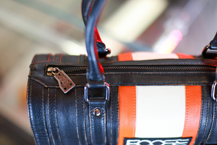 Carry the expression of motorsport-style, tailor-made for the woman who lives life in the fast lane. The Foose Performance Handbag is sculpted in rich black premium leather and accented with dynamic racing stripes in Foose’s signature orange and ivory palette.