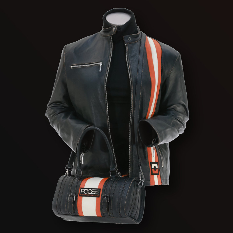 Created with black premium napa leather, this limited-edition jacket is sculpted to embody style, design, and performance. Foose’s signature color orange and ivory racing stripes inject kinetic energy into the silhouette, a dynamic nod to the high-octane world of custom builds and performance. Like all of Chip’s designed, intentional details abound. Hand-finished vintage-wear detail along the edges and seams for a rugged feel, a tailored profile built for the drive, and sturdy YKK hardware re-worked with an automotive edge. The zipper pull is styled like a gas pedal—a tribute to automotive roots. The Foose Performance ingot subtly anchors the stripes in the front, while a discreet Foose Performance logo adorns the back. The interior is a custom logo cotton-canvas lining that delivers comfort.